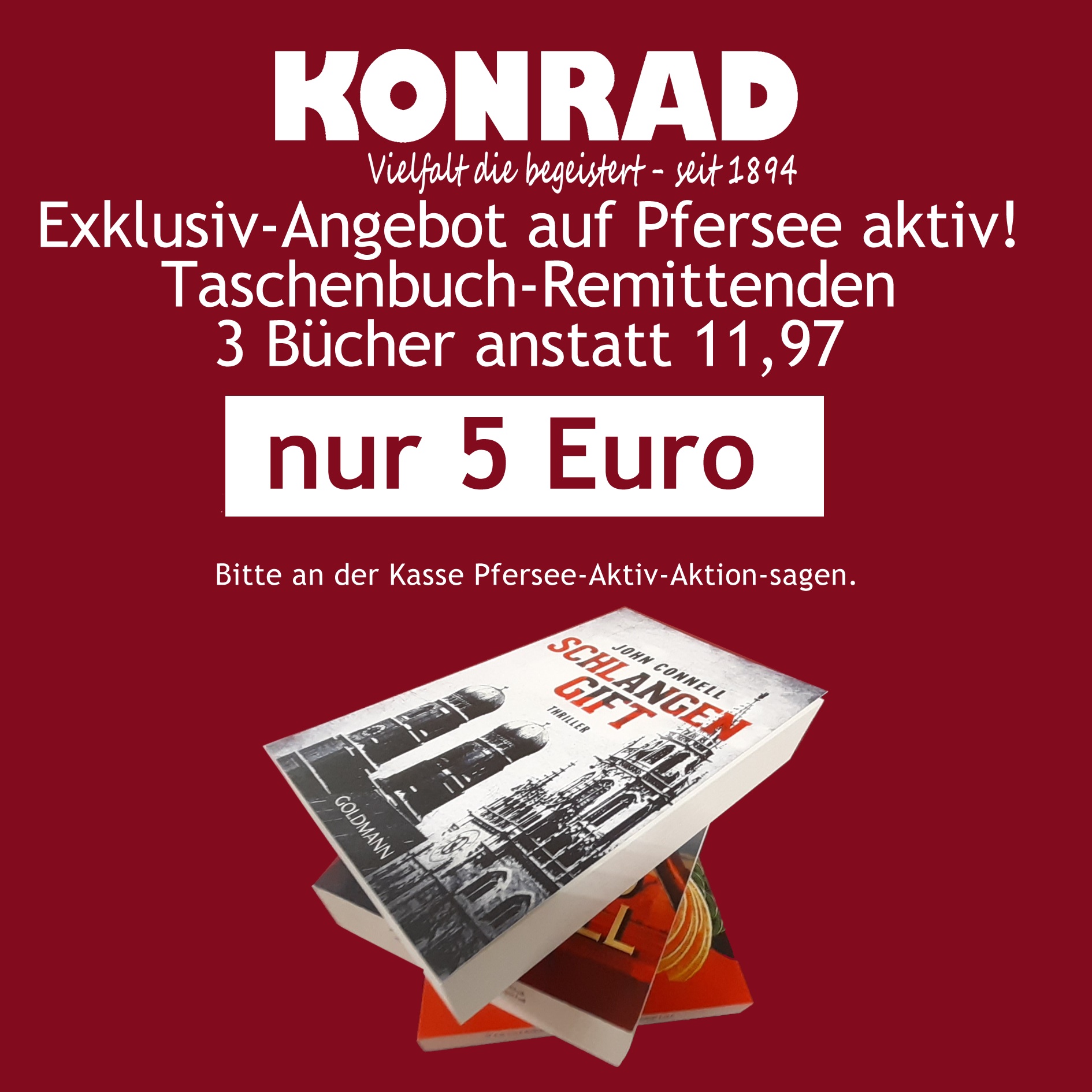 Exklusiv-Aktion auf Pfersee aktiv! Taschenbuch-Remittenden 3 Bücher anstatt 11,97 nur 5 EURO. Bitte an der Kasse Pfersee-aktiv-Aktion sagen.